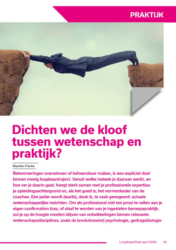 Belemmeringen overwinnen of beheersbaar maken is een kernonderdeel van bijna elk loopbaantraject. Maar hoe effectief zijn de methoden die we hiervoor inzetten eigenlijk? In de nieuwste editie van LoopbaanVisie (april 2026) onderzoekt Maarten Freriks, mede-oprichter van id Plein, waarom we als professionals vaker de wetenschap als kompas zouden moeten gebruiken.